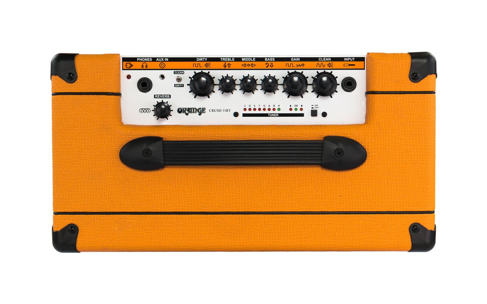 Le 35RT est le plus équipé des amplis de la série Crush. Avec son système Twin Channel, son préampli, sa puissance de 35 Watts et son haut-parleur 10'' Voice of the World sa sonorité est spectaculaire . L'accordeur chromatique, le système de Reverb et la prise auxiliaire lui donnent une vraie polyvalence. Le nouveau FX Loop permet de brancher ses effets directement sur l'ampli, sans sacrifier la tonalité. On oublie pas le système CabSim, qui émule les sonorités d'un 4*12 lorsqu'on branche l'ampli à une source d'enregistrement. Le 35RT est un excellent ampli, assez puissant pour ses premier concerts et la porte d'entrée parfaite pour le monde Orange.
