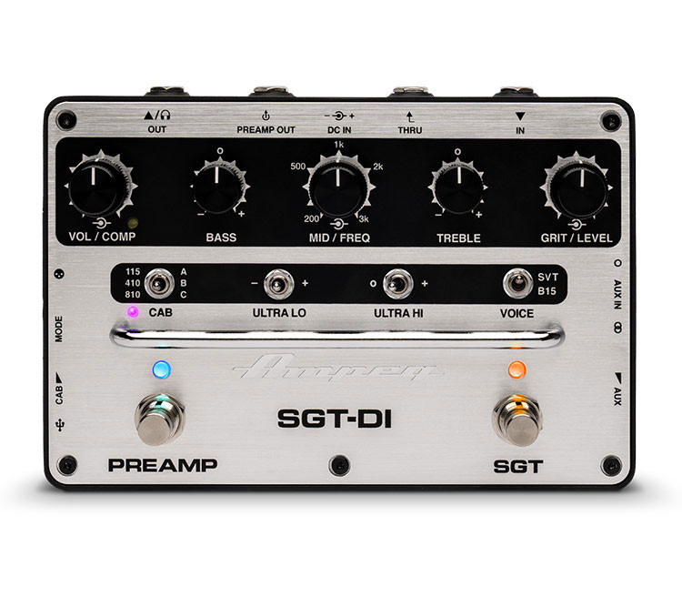 Le préampli et boitier DI Ampeg SGT-DI™ offre aux bassistes modernes un rig complet dans une seule pédale. Il offre un circuit d'overdrive Super Grit Technology™ amélioré avec les voicing emblématiques Ampeg SVT® et B15, un égaliseur 3 bandes polyvalent désormais avec circuit Mid balayable, des commutateurs Ultra-Hi et Ultra-Lo à 3 voies, un compresseur variable et des connectiques Aux /Headphone.