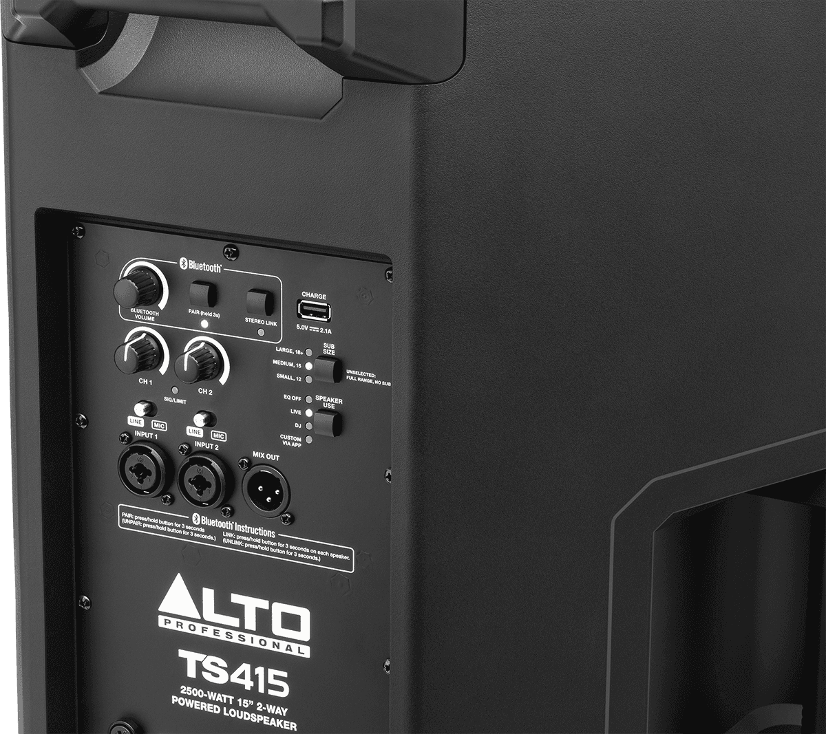 Le troisième canal Bluetooth dédié présente un potentiomètre de réglage du niveau afin de paramétrer finement le volume de diffusion d’un morceau via un smartphone ou tout autre appareil Bluetooth compatible. Un bouton PAIR autorise l’appairage d’un appareil Bluetooth compatible à l’enceinte, tandis que le Stereo Link vous permettra d’appairer une autre enceinte TS4 à proximité sans avoir besoin de câbles.