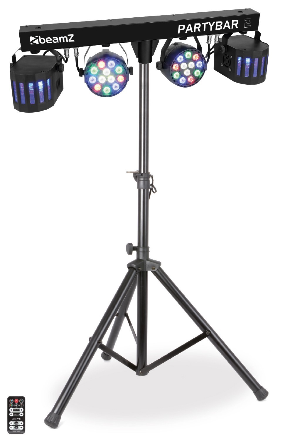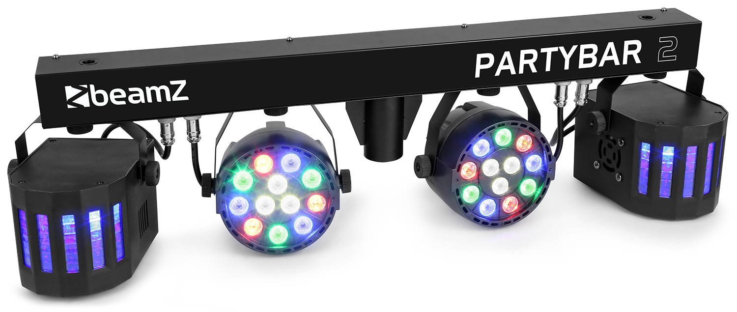 Le Partybar2 est un ensemble idéal pour les DJs avec 2 projecteurs PAR avec LEDs RGBW haute densité et 2 projecteurs Derby. Le Partybar2 peut être contrôlé par DMX, via la télécommande infrarouge ou avec les programmes automatiques et gérés par le son, sélectionnables depuis le panneau de commande. Un pied tripode est livré pour un installation rapide et facile. Cet ensemble est idéal pour la scène, des soirées, des animations ou tout autre événement festif.