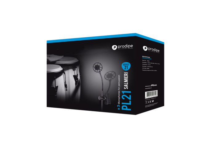 Pack de trois micros destinés à la sonorisation des congas, bongos, djembés, cajons, timbales, rototoms, tambourines, tablas, batas, darboukas, bendirs, bodrhans, toms, caisses claires, tambours, surdos, talking drums, udus, steel drums...